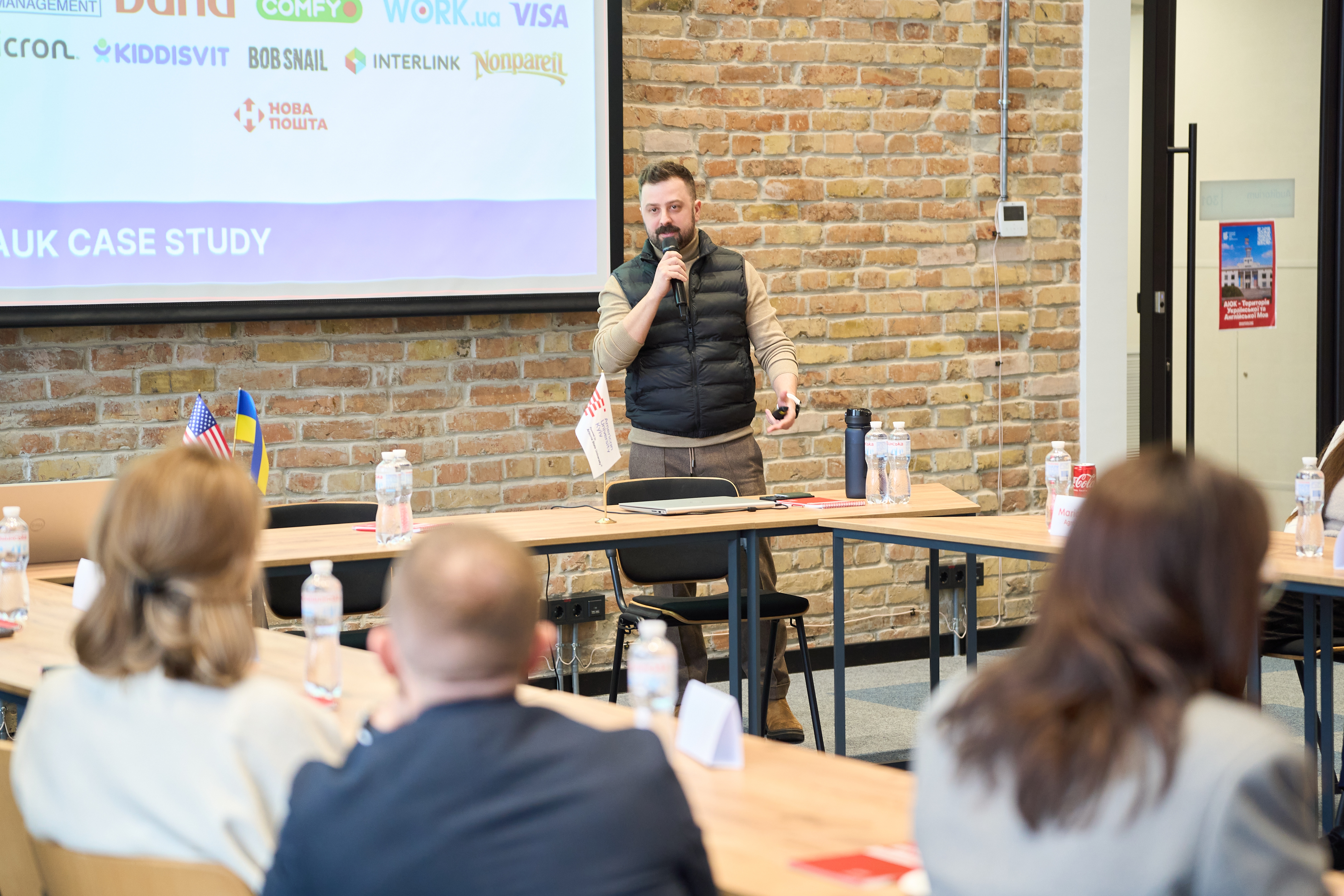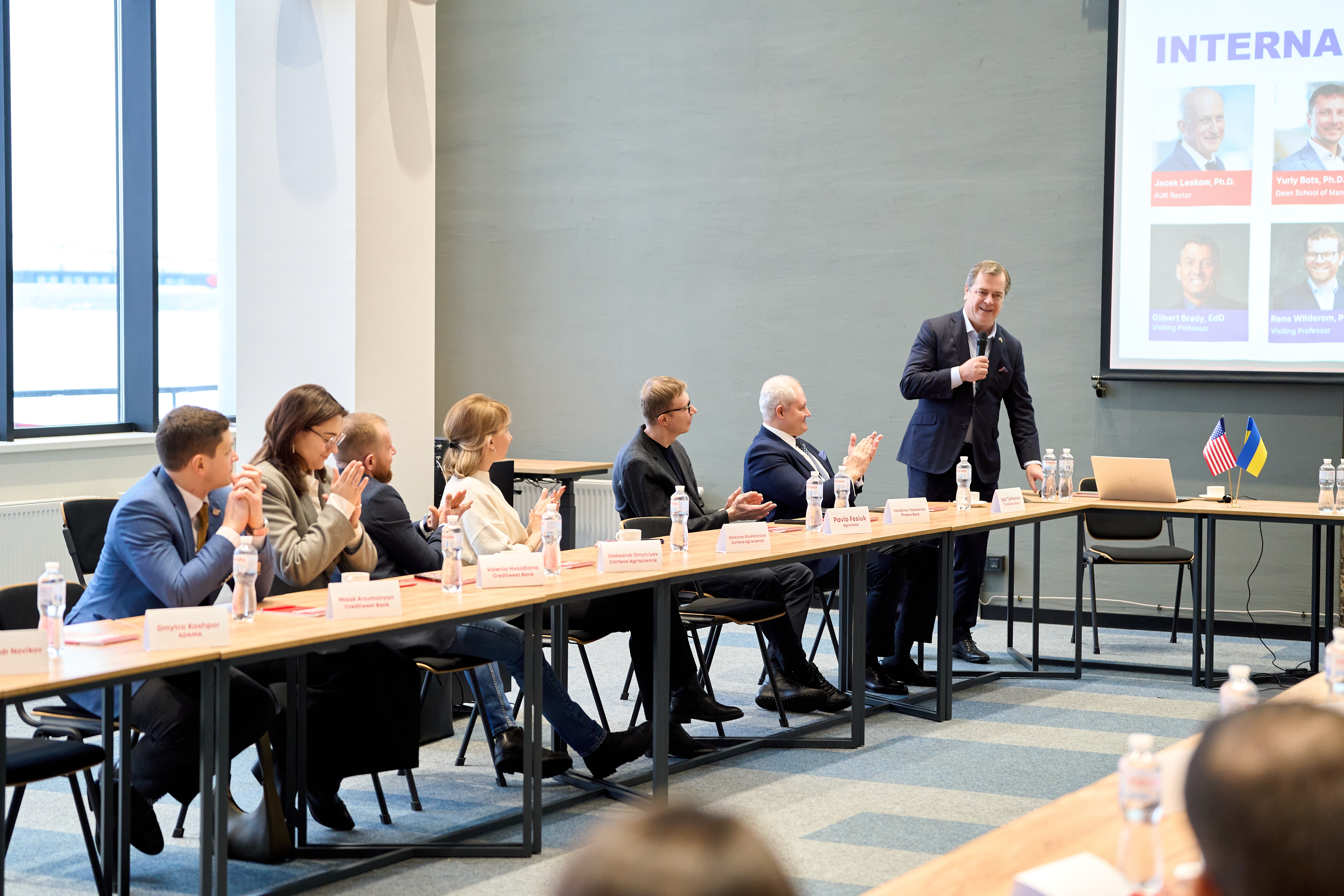 До розмови долучилися: Ден Райс, президент АЮК; Andrii Korol, директор з розвитку АЮК, а також лідери українського бізнесу — Igor Tykhonov, Голова правління Creditwest Bank Ukraine, Maria Osyka, директор з аграрних інвестицій представництва NCH в Україні, та інші партнери і гості університету.