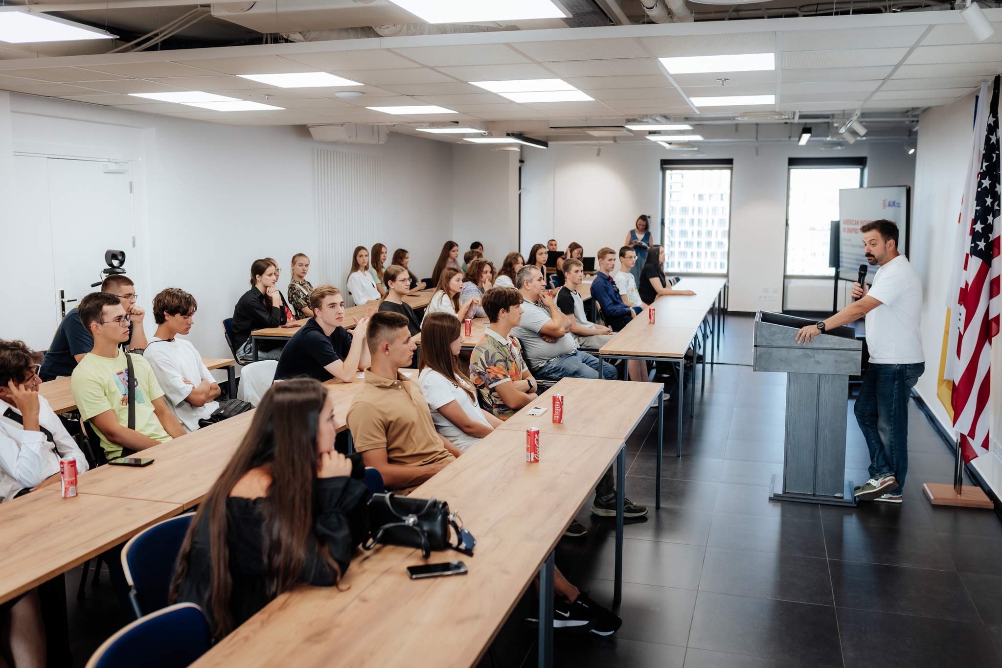 Студентів тепло привітав директор з регіонального розвитку Андрій Король, а також спеціальне відеопривітання для Дніпра записав президент AЮK Ден Райс.